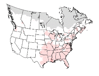 This image shows the distribution of the Barred Owlin the U.S. and parts of Canada. The pink and red shaded areas are where this owl has been found. The darker the shade of pink, the greater the number of owls found in that area. |